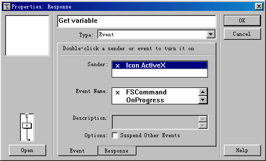 4、向“dispaly variable”圖標的右方拖入一個計算圖標,命名為“get variable”,并將交互響應類型設為“事件(event)”。這時在“get variable”圖標上方出現一個小圖標,雙擊該圖標,出現交互屬性設置對話框。雙擊“sender”選項中的“icon activex”,使其前面有個叉號,再雙擊“event”選項中的“fscommand”,使其前面也有個叉號,確定剛才的設置。