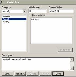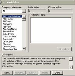用于刪除變量列表框中當(dāng)前處于選中狀態(tài)的自定義變量。為了避免造成錯(cuò)誤,authorware會(huì)自動(dòng)檢查程序中是否存在對(duì)自定義變量的引用,只有程序中不再使用的自定義變量才允許被刪除。
