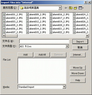 比較簡單的一個對話框,和 windows 平時使用的文件夾對話框差不多。選擇的時候你可以利用 shift 鍵來選擇多個元素同時引入,在下邊的 “file list” 框中利用 “move up” , “move down” 來改變他們的順序。也可以單擊 “add all” 來引入這個文件夾所包括的整個元素。選擇好之后,點擊 “import” 按鈕確定并關閉選擇對話框即可。