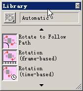 將 animation 下的 automatic 庫中的 rotation(frame-based) 行為和 fade in/out 行為拖到演員列表中,如圖: