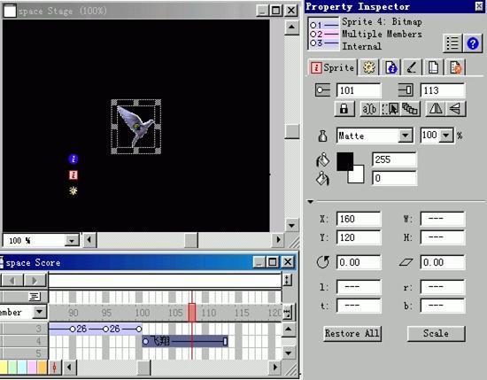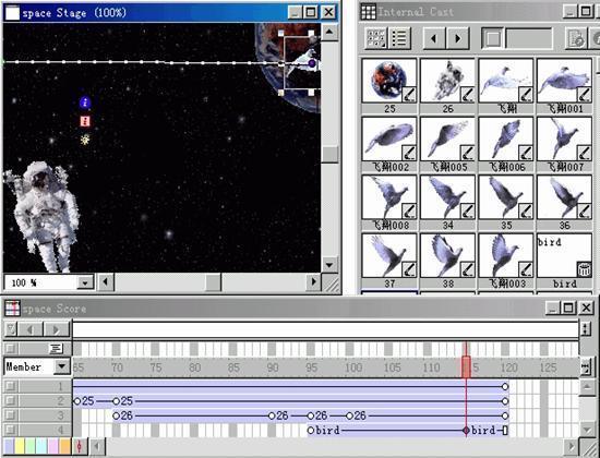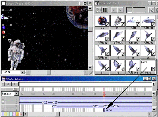 提示:在生成飛鴿電影循環后, internal cast 窗口中的飛鴿圖片組不能刪除,否則飛鴿電影循環 (bird) 將失去作用。