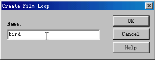 步驟 3 :在選中飛鴿動畫條后,按 ctrl+x ,將它剪到系統的剪切板中。然后在 internal cast 窗口選一個沒有演員的空單元,按 ctrl+v ,將剪切板中的飛鴿動畫信息粘幀到選中單元中,這時彈出一個建立電影循環的對話框,在輸入框中給飛鴿的電影循環另外命名為 bird ,如圖 14 所示。