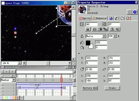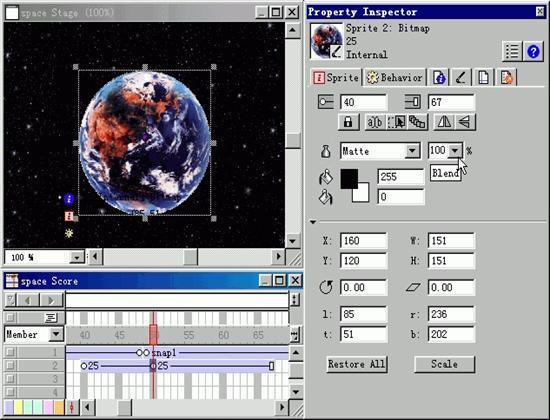 在 director 電影中,所有的演員( cast )都是用一種特定類型的墨水模式顯示的,默認的墨水模式是 copy ,這是一種不透明的效果,適合顯示矩形圖形,并且有最快的顯示速度,而對非矩形則會將其白底也被顯示出來(如圖 2 舞臺中的地球)。另一個常用的墨水效果是 matte ,它能將不規則演員的外面的白色部分屏蔽掉,這樣,邊界內部的東西就被顯示,而外邊的則顯示其后面的圖像(如圖 2 舞臺中的動態背景)。其它十幾種墨水模式就不再介紹,大家只要一一測試,就能弄清它們的特點。