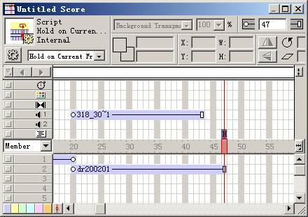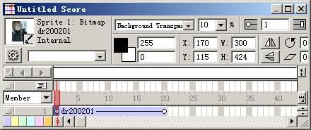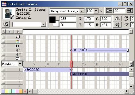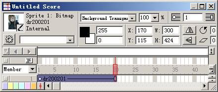 將位圖演員再次拖到場景中去,并且設(shè)置其起始楨為第二十楨,著墨方式為背景透明 (background transparent) ,注意該角色位置一定要與前邊位圖的角色位置完全重合,如圖: