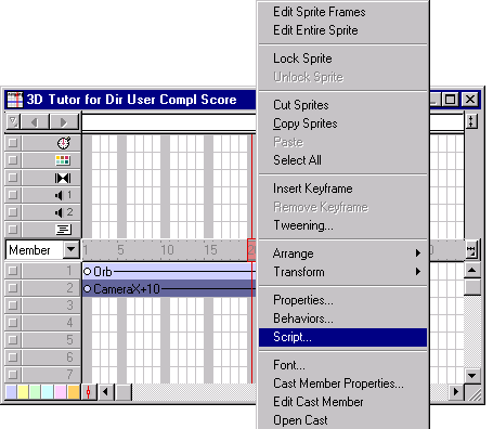 5 、在分鏡表中右鍵這個按鈕角色(在通道 3 ),在彈出的菜單中,選取 “script…” ,打開 script 窗口。
