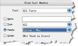 提示:如果你的演員表中擁有大量的演員,一時難以找到需要的演員,此時最有效的方法是使用 edit > find > cast member 命令,該命令可通過演員的名字、類型和調色板等查找到需要的演員,(如圖 22 )讀者可參考 10-3 節中清除未使用的演員部分。