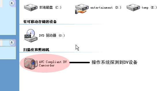 在視頻捕捉前,請務(wù)必確定將dv相機的電源打開并保證1394線連接正常。然后將dv打開,模式設(shè)置為play(或vcr檔,如果想捕捉正在拍攝的畫面可以將dv狀態(tài)設(shè)置為記錄)。將dv打開后,如果連接正常應(yīng)該在“我的電腦”中發(fā)現(xiàn)你的dv設(shè)備,如圖3-1所示。