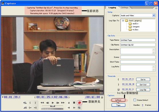 在最左邊的時間碼是當(dāng)前時間指針?biāo)跁r間位置,稍微靠右邊的是設(shè)置in point的時間,傍邊的則是設(shè)置out point點的時間;最右邊的時間碼則是設(shè)置in點與out點之間的時間總和,也就是將要進行in/out采集的時間總長度。一切都準(zhǔn)備好了以后就可以進脅杉耍贑apture控制區(qū)內(nèi)點擊in/out按鈕就可以對設(shè)置出入點的素材進行采集了,如圖2-18所示。