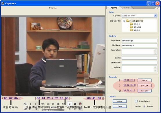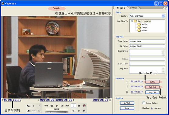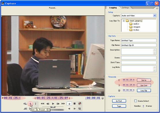 這里要經(jīng)常反復(fù)的預(yù)纜,然后在自己覺得比較有用的地方通過點擊采集控制區(qū)的set in point按鈕 或者在timecode 控制區(qū)中點擊set in按鈕來設(shè)置入點(set in point)。