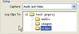 在setup設(shè)置區(qū)中 capture(采集)選項是用來選擇采集那些素材的,在下拉菜單中有3個選項:audio and video(音頻和視頻)、video(視頻)和audio(音頻)。如果選擇了audio and video(音頻和視頻)就是同時采集音品信息和視頻信息,若選擇video(視頻)或audio(音頻)則是只采集視頻或者只采集音頻。log clip to(截取素材到)是用來設(shè)置將才的素材存放到project窗口的那個文件夾下面,圖3-4的設(shè)置是將采集到的素材存放到video文件夾中。