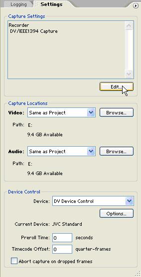 圖3-3 premiere pro的capture(捕捉)窗口