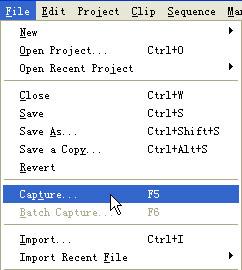 進入premiere pro,先要設(shè)置工程屬性(project settings),選擇相應(yīng)的工作模式。完成設(shè)置后通過圖3-2所示的菜單命令file->capture 或者直接按快捷鍵f5就可以啟動premiere pro的捕捉窗口(capture),如圖3-3所示。
