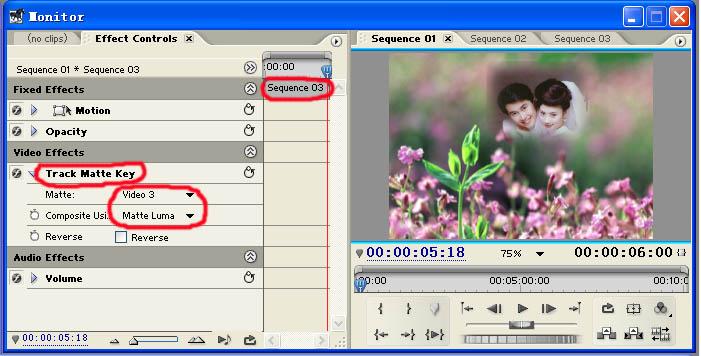 11.選中軌道2中的sequence 03,在效果控制窗口中展開效果track matte key效果,在matte中選擇video 3,在composite using中選擇matte luma。