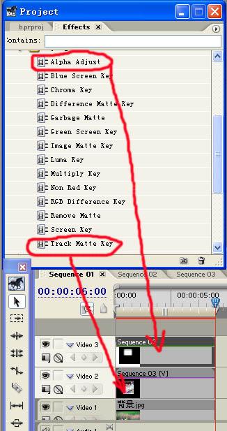 9.打開視頻效果keying文件夾,將alpha adjust效果拖入sequence 01軌道3的sequence 02中,將track matte key效果拖入軌道2的sequence 03中。