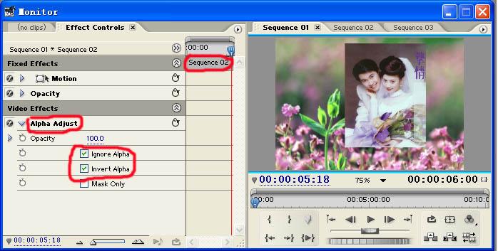 10.選中軌道3中的sequence 02,在效果控制窗口中展開效果alpha adjust,選中lgnore alpha和lnvert alpha選項。