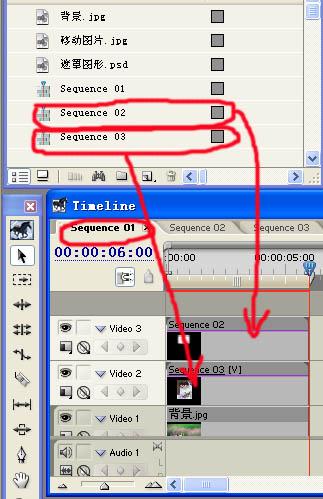 8.然后,將sequence 02拖入sequence 01的軌道3中,將sequence 03拖入sequence 01的軌道2中。