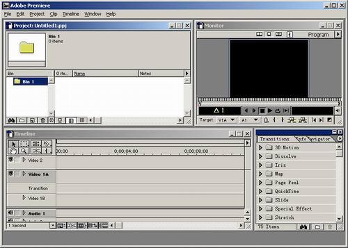 (2) 在“load project settings”對話框中選擇一個預設,單擊“ok”,彈出premiere6.0工作界面,如圖2所示。