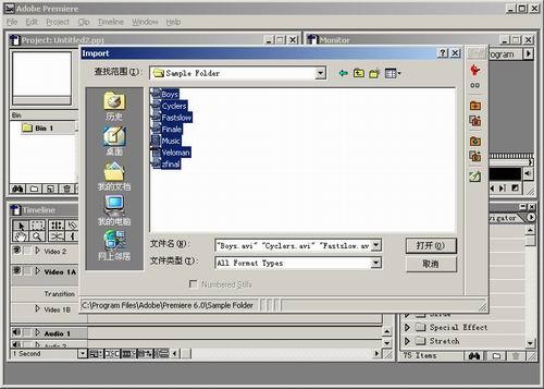(2) 我們以premiere6.0自帶的素材為例介紹。在“premiere6.0>sample folder”目錄下選擇一個或多個素材,如圖5所示。