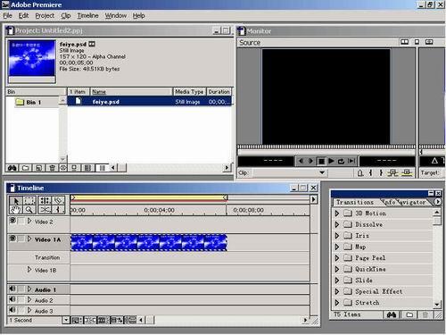 (1) 準(zhǔn)備一幅靜止圖片,將其導(dǎo)入project窗口,靜止圖片的默認(rèn)時(shí)長(zhǎng)根據(jù)系統(tǒng)參數(shù)的設(shè)定而有所不同。將其拖入timeline窗口,默認(rèn)時(shí)間5秒,如圖1所示。