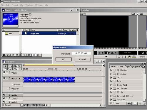 (3) 還可以直接在項(xiàng)目窗口中修改靜止的時(shí)長(zhǎng),單擊剪輯feiye.psd以選中它,如圖3所示。單擊clip菜單,從其下拉菜單中單擊選擇“duration”命令。
