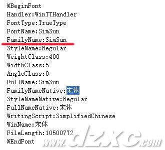 4.然后你修改下面圖中的紅線部分,將“familyname:”后面的英文改成“宋體”