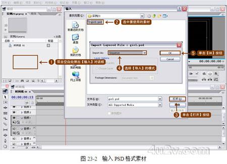 2、 導(dǎo)入素材文件。雙擊【項目】窗口空白處,彈出【輸入】對話框,導(dǎo)入光盤中【源素材】︱【實例 23 】中的【 girl. psd 】文件,如圖 23-2 所示。