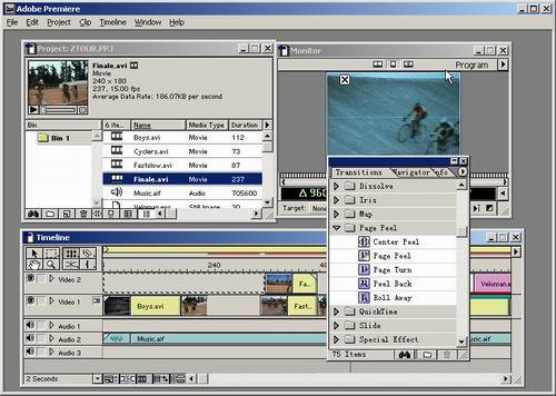 上面介紹的project(項目)窗口、timeline(時間線)窗口、monitor(監視器)窗口是premiere6.0中最為重要的三個窗口,除此之外,premiere6.0中還包含了一些輔助窗口,主要是給用戶的編輯工作帶來一些方便。這些窗口包括transition(過渡)、effect(效果)、navigator(導航)、infor(信息)、commands(命令)、history(歷史)等面板,下面一一介紹。