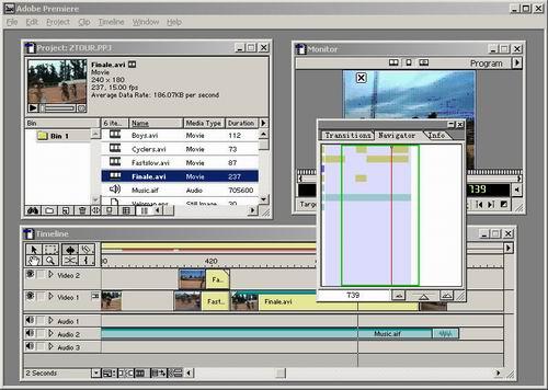 (6)單擊菜單“window>show navigator”命令,開啟 navigator(導航)面板,如圖17所示。顯示的是timeline窗口剪輯編排的略圖,不同的顏色分別表示不同的剪輯和過渡,利于用戶掌握整個節目編排的全貌,并且實現素材的快速定位。其中綠色的方框代表當前timeline窗口中所顯示范圍,紅色的垂直線標識了當前時間線的位置,并且和面板下方的文本框中顯示的幀數保持一致。