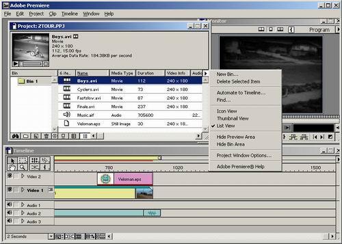 (4)剪輯箱中的剪輯一般有三種不同的顯示方式(如圖3):icon view(圖標顯示),;thumbnail view(縮略圖顯示);list view(列表顯示)。可以通過圖2所示的設置菜單選擇所需的顯示方式,也可以通過project窗口工具欄中相應的按鈕快速地切換顯示方式。