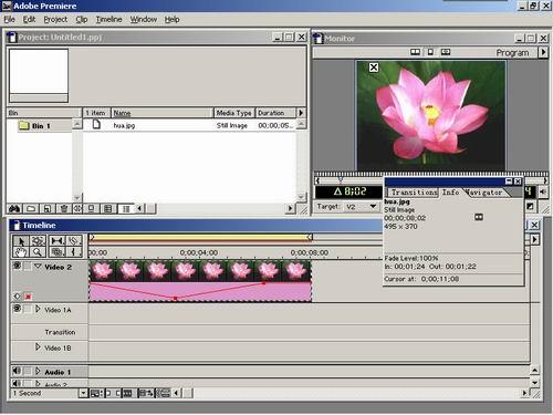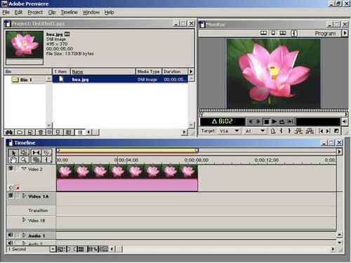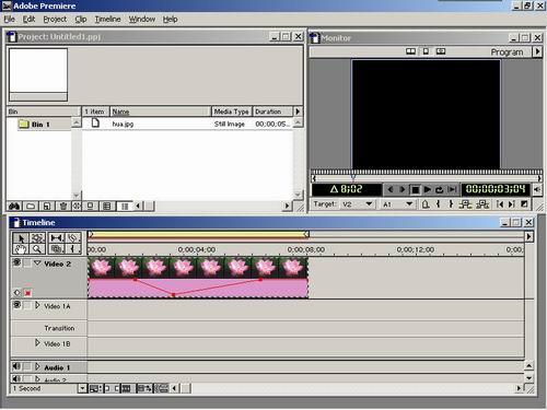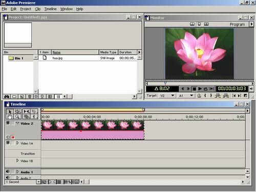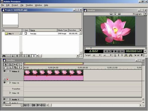 (1) 將準備好的剪輯素材導入project窗口中,再其拖入timeline窗口中video2軌道上,如圖1所示。