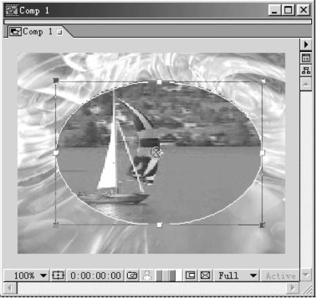 3.在timeline或comp1中選取上面那個(gè)視頻,用“l(fā)ayer→mask→new mask”菜單新建遮罩,再用“l(fā)ayer→mask→mask shape”和“l(fā)ayer→mask→free transform points”菜單對(duì)遮罩的形狀和大小進(jìn)行修改(圖3)。