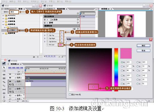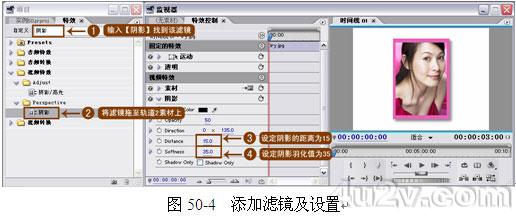 利用 premiere pro 1.5 中的【素材】、【陰影】和【斜邊】濾鏡的不同方式組合制作邊框的效果。【模擬邊框】如圖 50-1 所示,實際效果請欣賞隨書光盤中【源文件】︱【實例 50 】︱【模擬邊框效果】和【立體邊框效果】。
