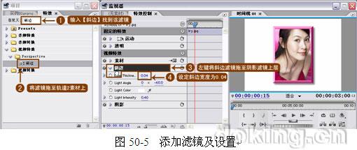 利用 premiere pro 1.5 的濾鏡來制作邊框和立體邊框效果。其流程大體為:首先新建項目,導入編輯目標素材文件,添加【素材】濾鏡,為素材添加邊框;然后添加【陰影】濾鏡模擬制作投影效果,最后添加【斜邊】濾鏡調整其順序并進行適當的調整設置,模擬制作立體邊框的效果。