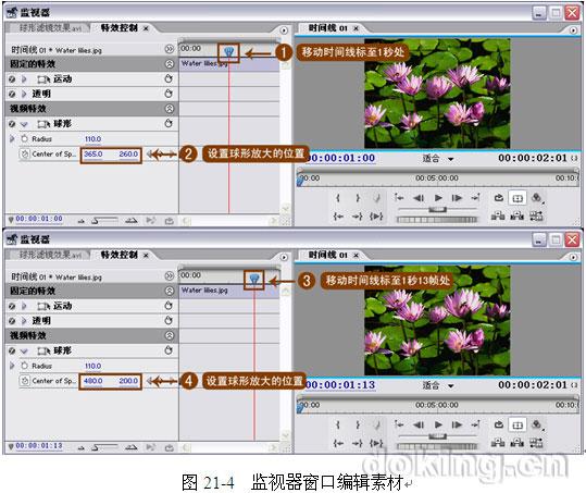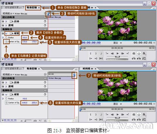 4、 編輯素材。將濾鏡添加至視頻編輯軌道中的素材上之后,對其做各項的編輯操作,如圖 21-3 和圖 21-4 所示。