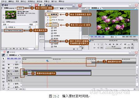 3、 編入素材。把素材文件拖入時間線窗口的編輯軌道中,準備進行編輯,如圖 21-2 所示。
