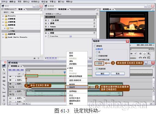 提示:抖動是非常有效的一個命令,它可以平滑因為大小縮放或者其他效果而產生不穩定的畫面。另外在圖片設定的運動或者添加字幕掛角等時候,畫面中的細線或者文字也會出現閃爍抖動,使用此命令可以有效地去除閃爍抖動,使畫面符合播出要求。