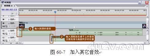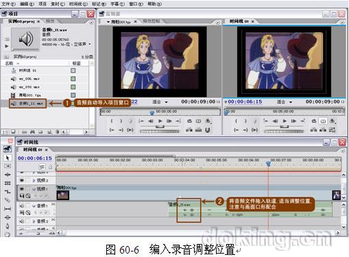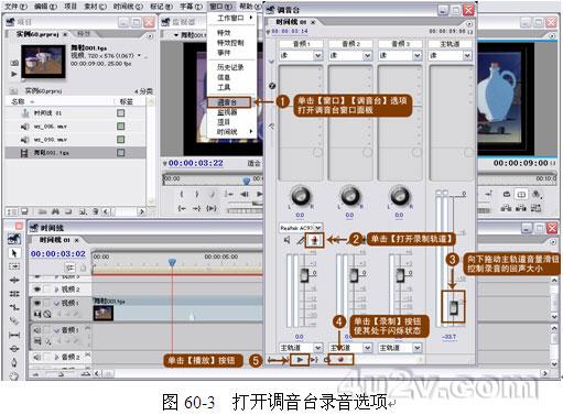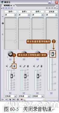 4、 進行錄音。首先編入所要配音的素材,然后打開調音臺面板開始進行錄音的工作,如圖 60-1 至圖 60-7 所示。
