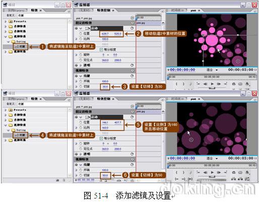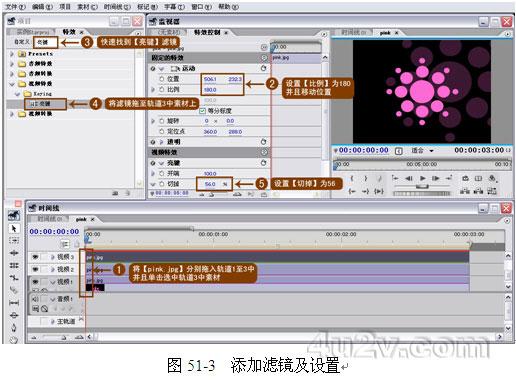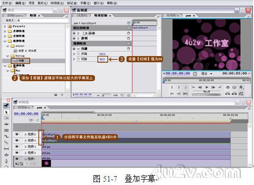 3、 編輯素材。新建時間線,然后編入目標素材至不同軌道,添加濾鏡并進行設置,如圖 51-2 和圖 51-4 所示。