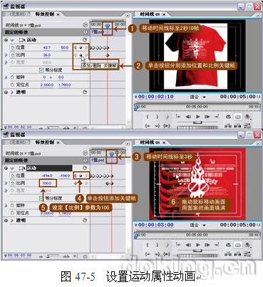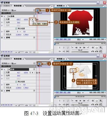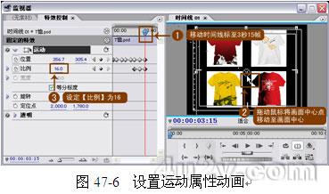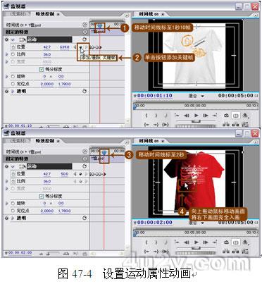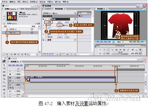 3、 編輯素材。編入素材至軌道,進行運動屬性的設置,如圖 47-2 至圖 47-6 所示。