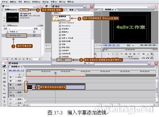 3、 編輯字幕。將字幕文件拖入編輯軌道中,添加濾鏡準(zhǔn)備進(jìn)行編輯,如圖 37-3 所示。