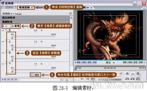 4、 編輯素材。將濾鏡添加至視頻編輯軌道中的素材上之后,對其做各項的編輯操作,如圖 28-3 所示。