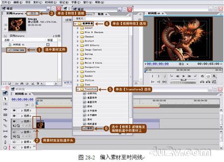 3、 編入素材。把素材文件拖入時間線窗口的編輯軌道中,準備進行編輯,如圖 28-2 所示。