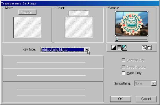 這時(shí),通過監(jiān)視窗只能看到圖標(biāo),而video1上的視頻不可見,這是因?yàn)檫€沒有對(duì)video2上的圖標(biāo)做透明設(shè)置。為了讓video1上的視頻可見,在時(shí)間軸中的圖標(biāo)上點(diǎn)右鍵,從菜單上選取video options→transparency,彈出transparency settings面板,在key type下拉列表中選white alpha matte,這樣圖標(biāo)周圍的白色背景就會(huì)變得透明,如圖17所示。