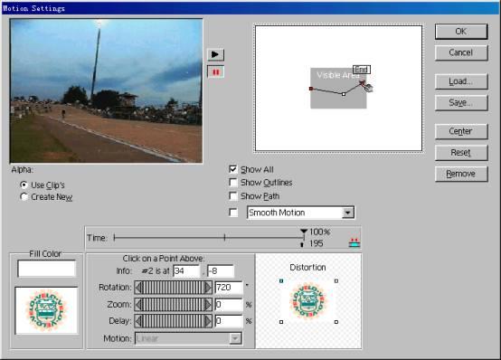 接下來就讓圖標(biāo)動(dòng)起來,先在時(shí)間軸中的圖標(biāo)上點(diǎn)右鍵,從彈出的菜單上選取video options→motion,出現(xiàn)motion settings對(duì)話框,在對(duì)話框左上部有一個(gè)運(yùn)動(dòng)預(yù)覽窗,點(diǎn)播放鍵 ,可看到視頻在播放的同時(shí),圖標(biāo)從左向右運(yùn)動(dòng),這是系統(tǒng)預(yù)設(shè)的運(yùn)動(dòng)方式。現(xiàn)在要讓圖標(biāo)從左側(cè)由小到大移向屏幕中心偏右的位置,再旋轉(zhuǎn)著向右側(cè)移動(dòng),逐漸縮小并消失。下面是具體步驟。
