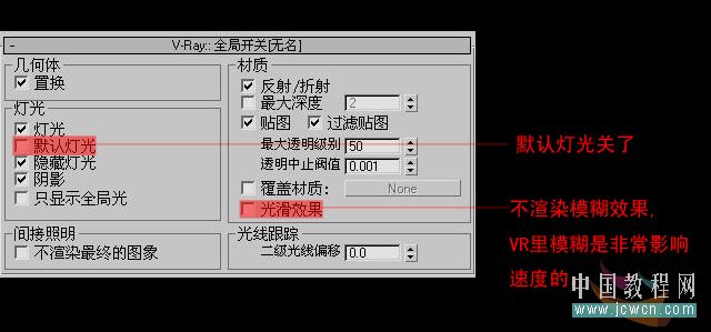 關閉默認燈光,不渲染模糊效果,VR里模糊是非常影響速度的
