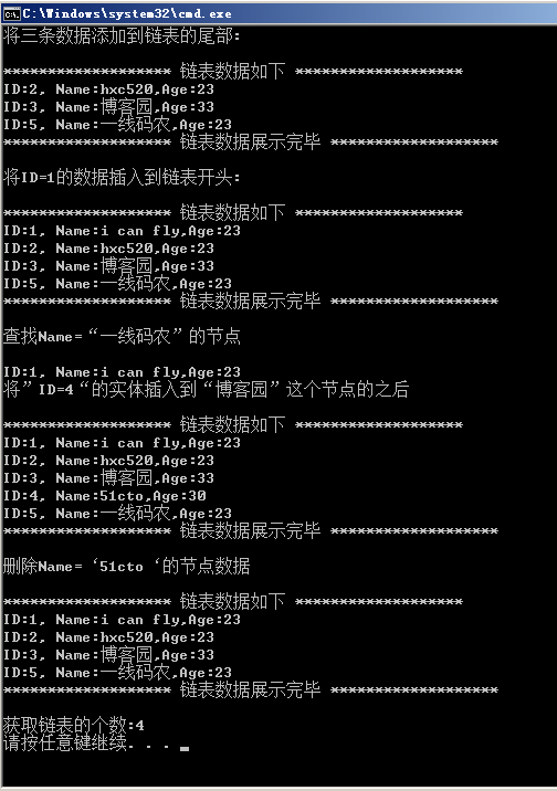 node = chainList.ChainListInsert(node, "博客園", i => i.Name, new Student() { ID = 4, Name = "51cto", Age = 30 });
