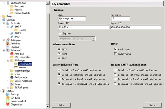 至此,郵件服務器的基本配置完畢。hMailServer還有很多高級配置,包括日志、簽名、文件大小限制等,這里就不詳細說明了。