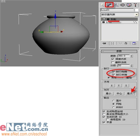 2、單擊“修改”命令面板,在修改器下拉列表中選擇“車削”項,默認下,實體會有所扭曲,調整其參數,然后單擊“對齊”欄下的“最大”按鈕,得到勻稱的陶罐實體,如圖2所示。