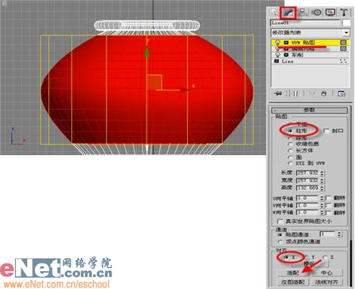 8、單擊“修改”命令進入其面板,在下拉列表中選擇“uvw貼圖”項并進入其屬性面板,展開參數卷展欄,選擇“貼圖”欄中的“柱形”單選框,然后在“對齊”欄下單選“x”單選框,最后點擊“適配”按鈕,如圖7所示。