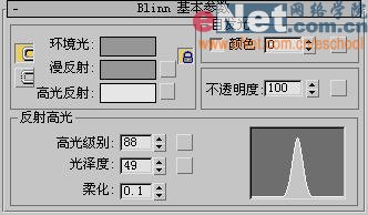2、在“blinn基本參數”卷展欄中,修改反射高光下的高光級別、光澤度、柔化度等值,如圖4所示。